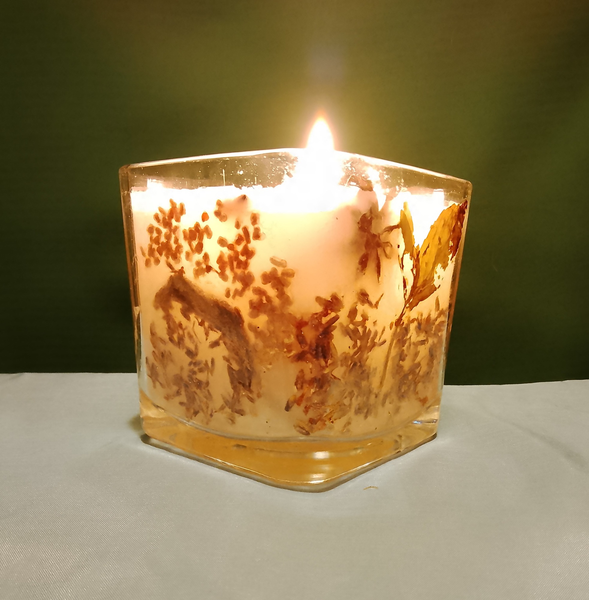 Candles are made with premium paraffin wax for a longer burn time. All botanicals such as herbs, flowers, spices and zests are organic and earth-grown. Candles are unique from each other as each is crafted individually by hand. Candles must be lit once to activate them. To activate your candle's intention (Joy, Prosperity, etc.), you must light it once. After this initial lighting, your candle will continue to radiate its purpose when a stronger presence is needed, light the candle and allow it to burn for a while to amplify its energy.